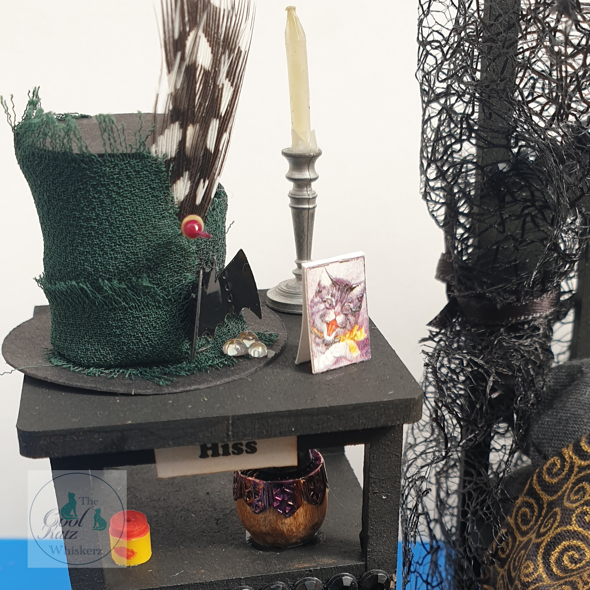 A few relevant books on spells and learning to fly a broomstick helped along with bottles and jars of unguents and potions to complete the look.